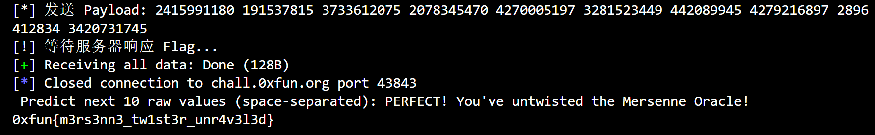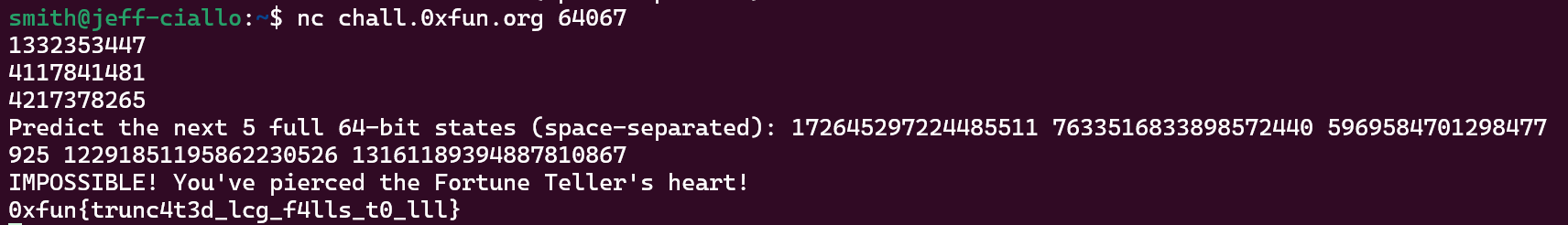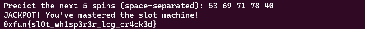 print("[*] Reconstructing Flag...") seed_int = 0 for i in range(DIM): if solution[i] == 1: seed_int |= (1 << i) try: flag_bytes = int(seed_int).to_bytes(256, 'big') flag = flag_bytes.replace(b'\x00', b'') print("\n" + "="*60) print("FLAG:", "0xfun{" + flag.decode(errors='ignore') + "}") print("="*60 + "\n") except Exception as e: print(f"[-] Decoding error: {e}")
