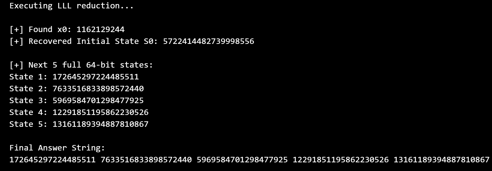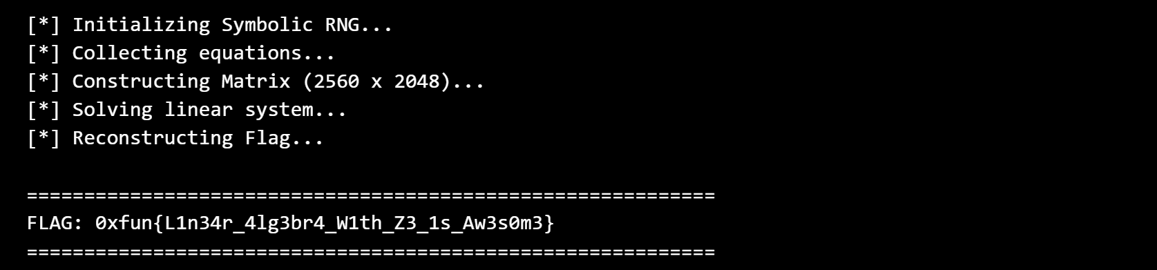 print("[*] Initializing Symbolic RNG...") rng = SymbolicGiantLinearRNG() matrix_rows = [] target_vector = [] print("[*] Collecting equations...") for k, real_val in enumerate(real_outputs[:40]): sym_val = rng.next() for bit_i in range(64): coeffs = sym_val.bits[bit_i] target_bit = (real_val >> bit_i) & 1 matrix_rows.append(coeffs) target_vector.append(target_bit) print(f"[*] Constructing Matrix ({len(matrix_rows)} x {DIM})...") M = Matrix(F, matrix_rows) b = vector(F, target_vector) print("[*] Solving linear system...") try: solution = M.solve_right(b) except ValueError as e: print("[-] Solver failed.") print(e) return